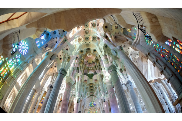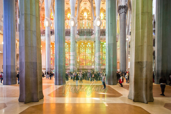 Las espectaculares columnas del interior de la Sagrada Familia recuerdan a árboles que dividen sus ramas hacia la bóveda.Los ventanales con vidrieras de colores permiten la iluminación por luz natural del templo que llena de vivos y mágicos tonos su amplio interior.